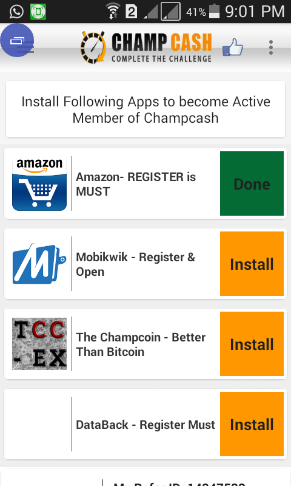 After register the Champcash, it gives some apps to become an active member for earning with referral as a challenge, then you have installed some recommended apps and use it for preferred days as per instructions.